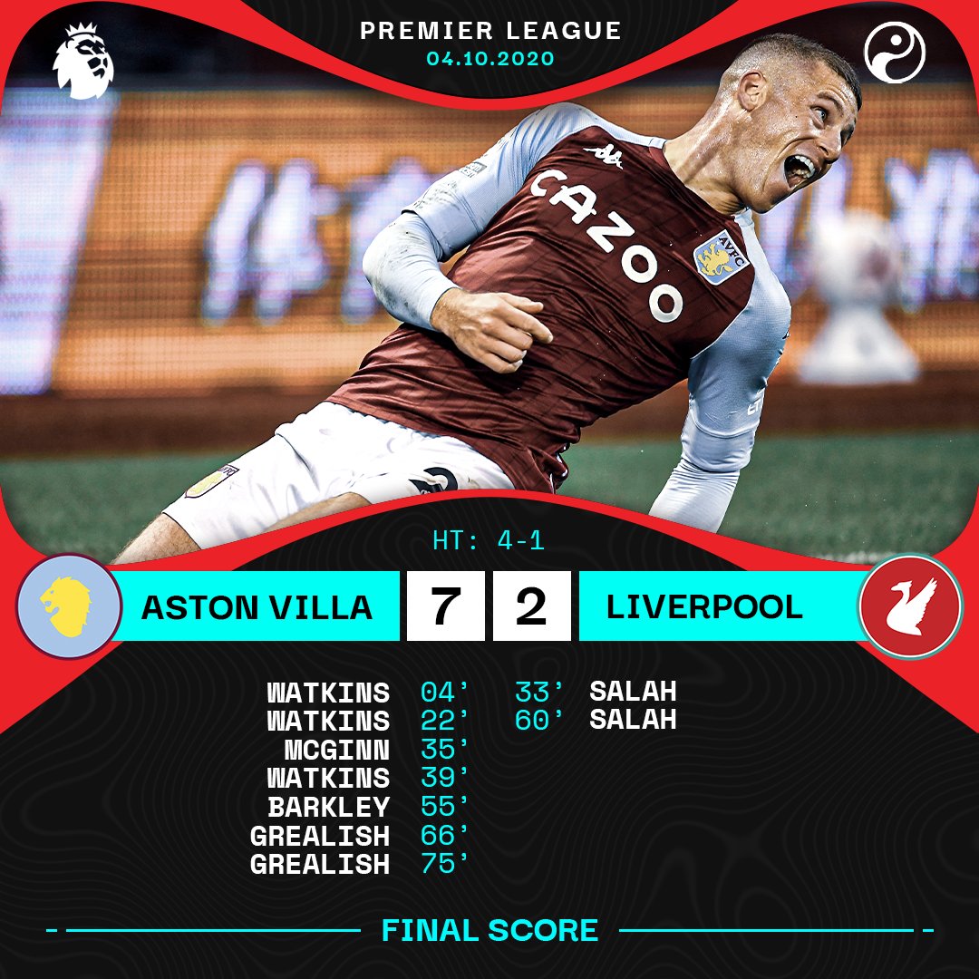 Giacomo pisa 4th oct 2020, 16:06. By phil vogel @pbvogel oct 4, 2020, 9:10pm bst. All the statistics from the aston villa versus liverpool match played in the premier league on oct 4, 2020, including shots on target, number of passes, tackles, cards and more. Aston villa hit seven goals past champions liverpool as they emphatically made it three wins from three in the. Fabrizio romano provides updates in exclusive interview Aston villa have lost six of their last seven fa cup games against liverpool, though they did. A chance for liverpool to try and grab a consolation. The villans led after only four minutes when liverpool goalkeeper adrian conceded possession to jack grealish, who teed up watkins for a simple finish. Also available on the nbc app. Highlights from aston villa's win over liverpool in the premier league. Three wins in three league matches. Ollie watkins scored a hat trick and jack grealish scored twice as villa. Three minutes of added time have been signalled at villa park.